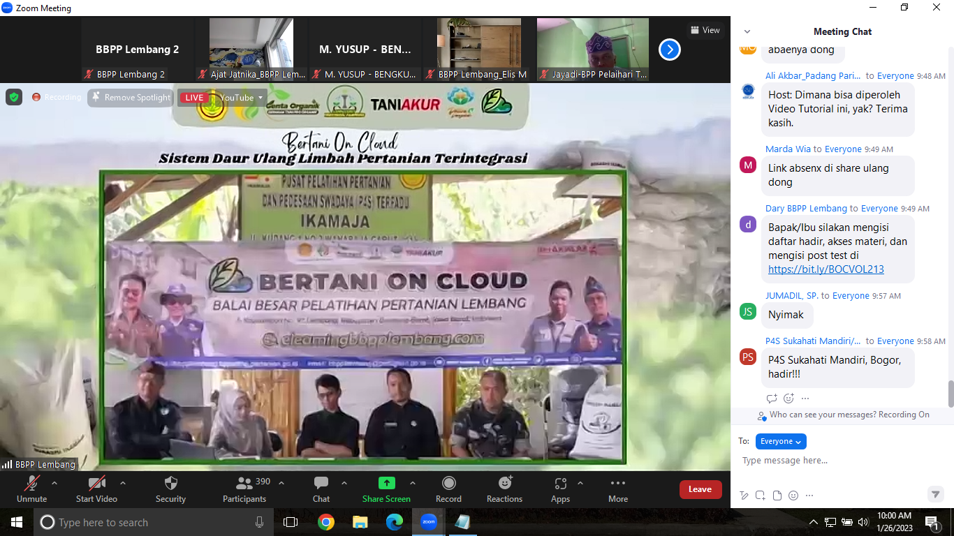 Balai Besar Pelatihan Pertanian (BBPP) Lembang bersama Pusat Pelatihan Pertanian Perdesaan Swadaya (P4S) Terpadu Ikamaja dipercaya sebagai penyelenggara Bertani on Cloud (BOC) Volume 213 pada Kamis (25/1/2023). Program yang menjadi agenda rutin Pusat Pelatihan Pertanian tersebut kali ini menyajikan tema besar Genta Organik dengan judul Sistem Daur Ulang Pertanian Terpadu. Tema dipilih dalam mendukung salah satu bentuk implementasi program teranyar yang tengah dicanangkan Badan Penyuluhan dan Pengembangan SDM Pertanian (BPPSDMP) yakni Gerakan Tanam Organik (Genta Organik).